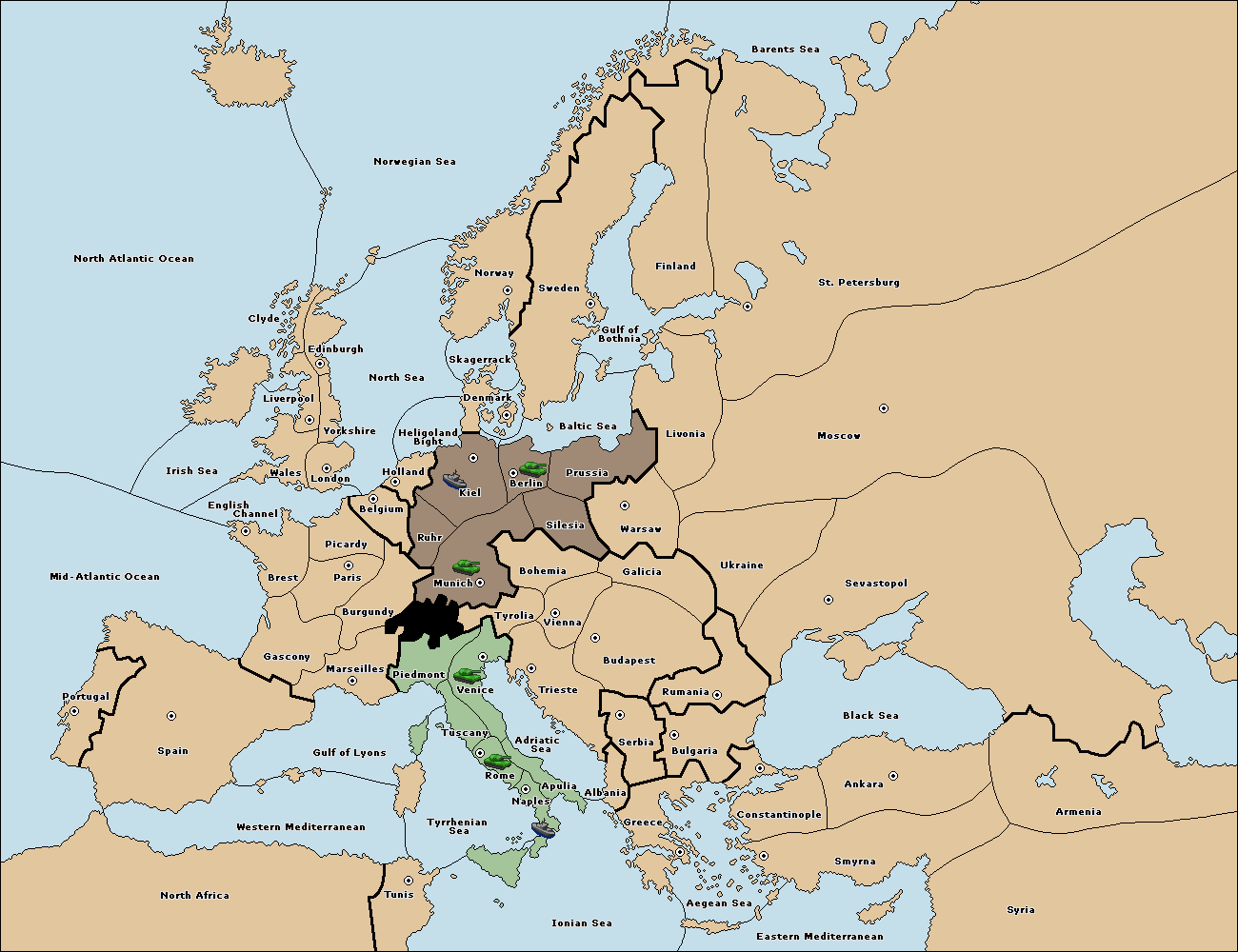 The standard Diplomacy map of Europe, but only Germany and Italy.